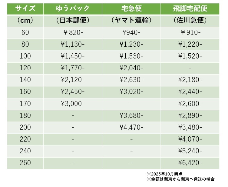 それぞれ荷物の大きさ(3辺合計)と重さによって料金が決まり、60サイズ(60cm以内)から140サイズ・160サイズといった区分で送料が設定されています。